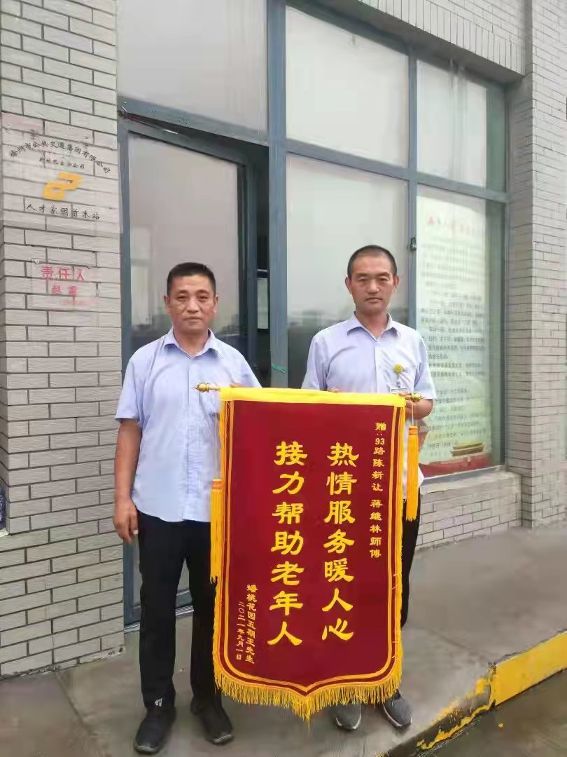 9月1日下午,在蟠桃花園站臺(tái)站有一位年邁的老人,手里緊緊握著一面書(shū)有“熱情服務(wù)暖人心,接力幫助老年人”的錦旗,在雨中等待著93路駕駛員陳新讓、蔣繼林的車(chē)輛,想要把這面飽含誠(chéng)摯謝意的“禮物”親手送給兩位師傅。