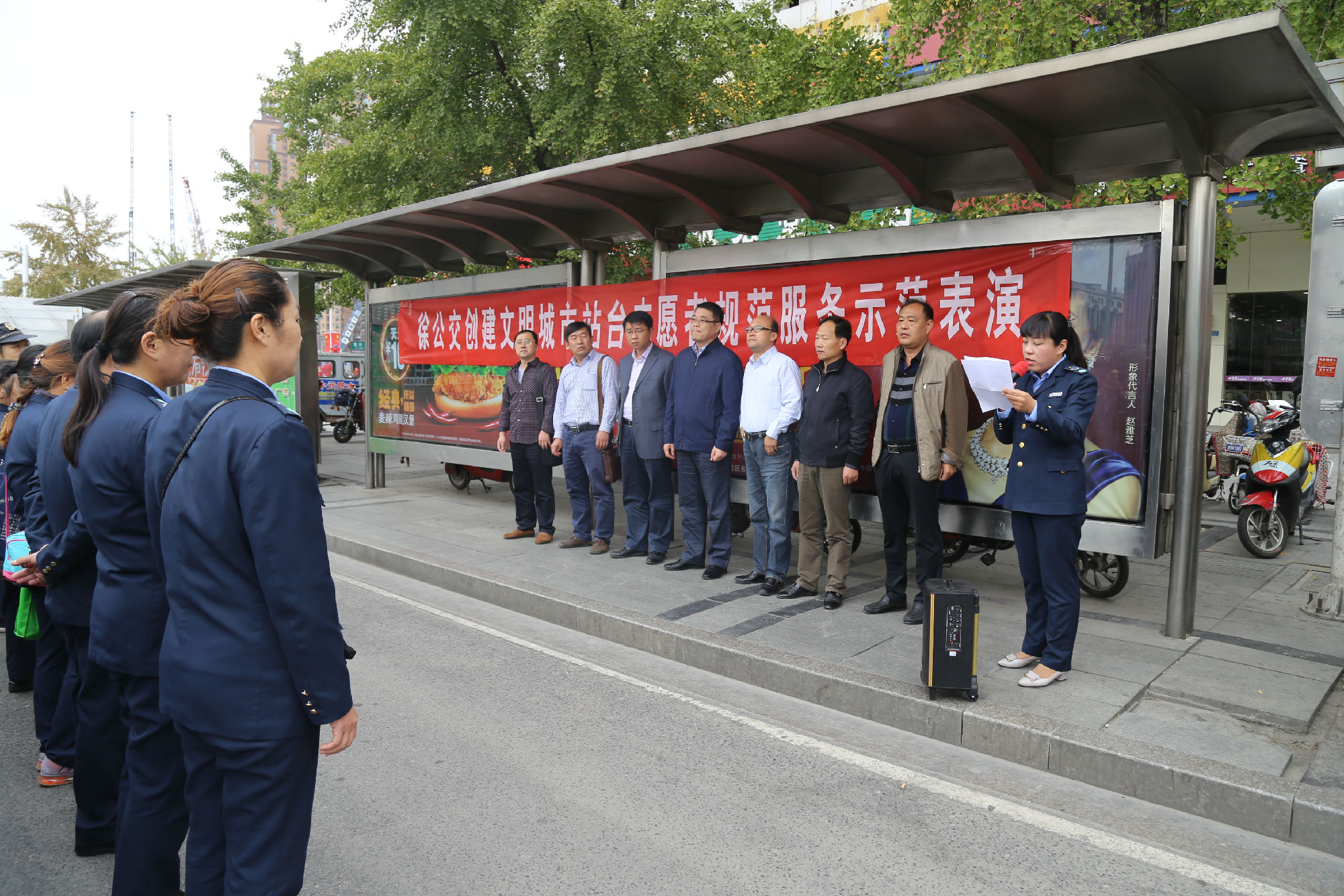 為進一步規(guī)范站臺服務(wù)引導(dǎo)工作,不斷推動文明城市創(chuàng)建順利進行,10月9日上午,公司在徐州站主廣場舉行了一次公交站臺秩序規(guī)范服務(wù)示范表演。團市委副書記夏友峰、運管處客運科科長陳福升、以及市創(chuàng)建辦交通秩序二組三位領(lǐng)導(dǎo)蒞臨觀摩。服務(wù)督導(dǎo)隊34名站臺志愿者參加了示范表演。