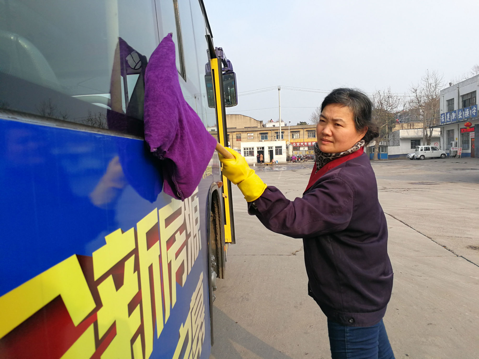 清晨5點,74路保潔員韓黎明已經(jīng)來到韓山車場,開始保潔車輛。由于氣溫較低,車場內(nèi)的水龍頭凍壞了,無法正常使用,她只好到遠一點的地方,將水一桶桶的運來,開始細心地擦拭玻璃,車輛外圍,車內(nèi)座椅、內(nèi)圍板....不放過一處角落。冬天的水冰涼刺骨,清洗抹布的手凍得通紅,搓搓手、跺跺腳,她又賣力的干了起來。車窗玻璃上厚厚的霜十分難擦,加上道路上經(jīng)常遇到灑水車,跑完一圈回來車身又臟了,增加了車輛保潔難度。韓黎明不怕辛苦,任勞任怨,只要有臟的地方,她就再次清潔,確保出場的每輛車都干干凈凈。期間,她的衣服多次被汗水浸透,晾晾汗,又凍得發(fā)抖,韓黎明沒有抱怨,仍然堅守完成自己的工作。
