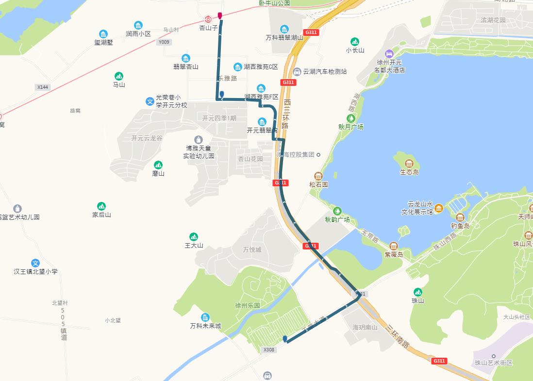 線路站點:建筑學院、江蘇師范大學、師范大學地鐵站、萬科新都會、港鑫城、南洋國際、康樂園南門、無名山公園地鐵站、銅山區(qū)政府、楚河金茂府、嵩山路、銅山新區(qū)總站、久隆鳳凰城北門、保利迎賓館、龍腰山公園、泉山森林海、第一人民醫(yī)院南門。