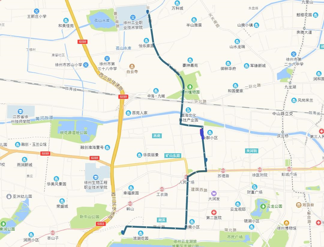 線路站點:山南小鎮(zhèn),山水龍瑞,馬場湖路口,馬場湖,怡康花園,后勤學院北,誠坤鋼材市場,蘇堤北路立交橋(西),蘇堤北路立交橋(東),蘇堤路小學,永業(yè)花園小區(qū),江蘇四監(jiān),銅沛路東口,中山北路立交橋