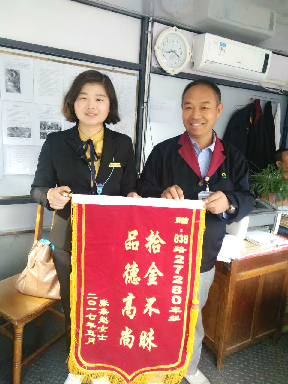 5月9日上午8:30左右,乘客趙女士帶著寫有“拾金不昧品德高”的錦旗,乘坐838路公交車趕到公交宣武車站調(diào)度室,雙手將錦旗交到站長助理梁昌明手里。